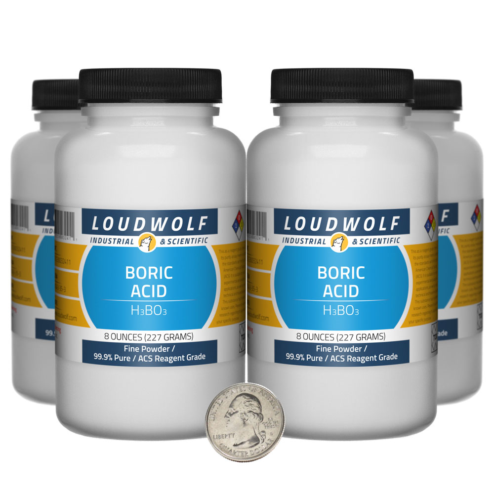 The item for sale is 2 Lb (32 Ounces) of Boric Acid (H3BO3). You get 4 bottles each containing 8 ounces of product. Boric Acid is a weak, monobasic Lewis acid of boron. It is water-soluble. For Thiourea and Sodium Bicarbonate, check out our other listings. |