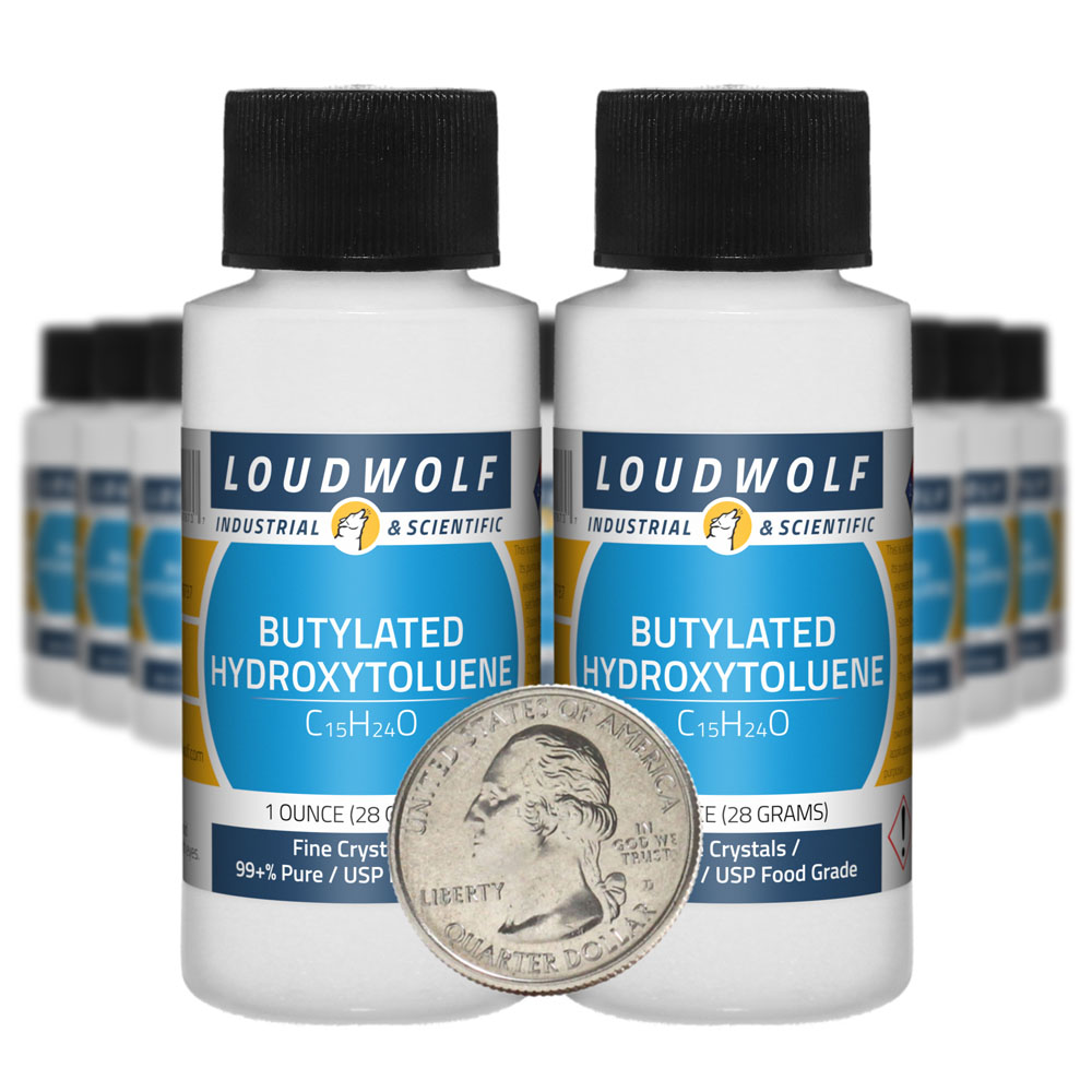 The item for sale is 1.3 Lb (20 Ounces) of Butylated Hydroxytoluene (C15H24O). You get 20 bottles each containing 1 ounces of product. Butylated Hydroxytoluene, also known as BHT, is a lipophilic organic compound commonly used as an antioxidant food additive.