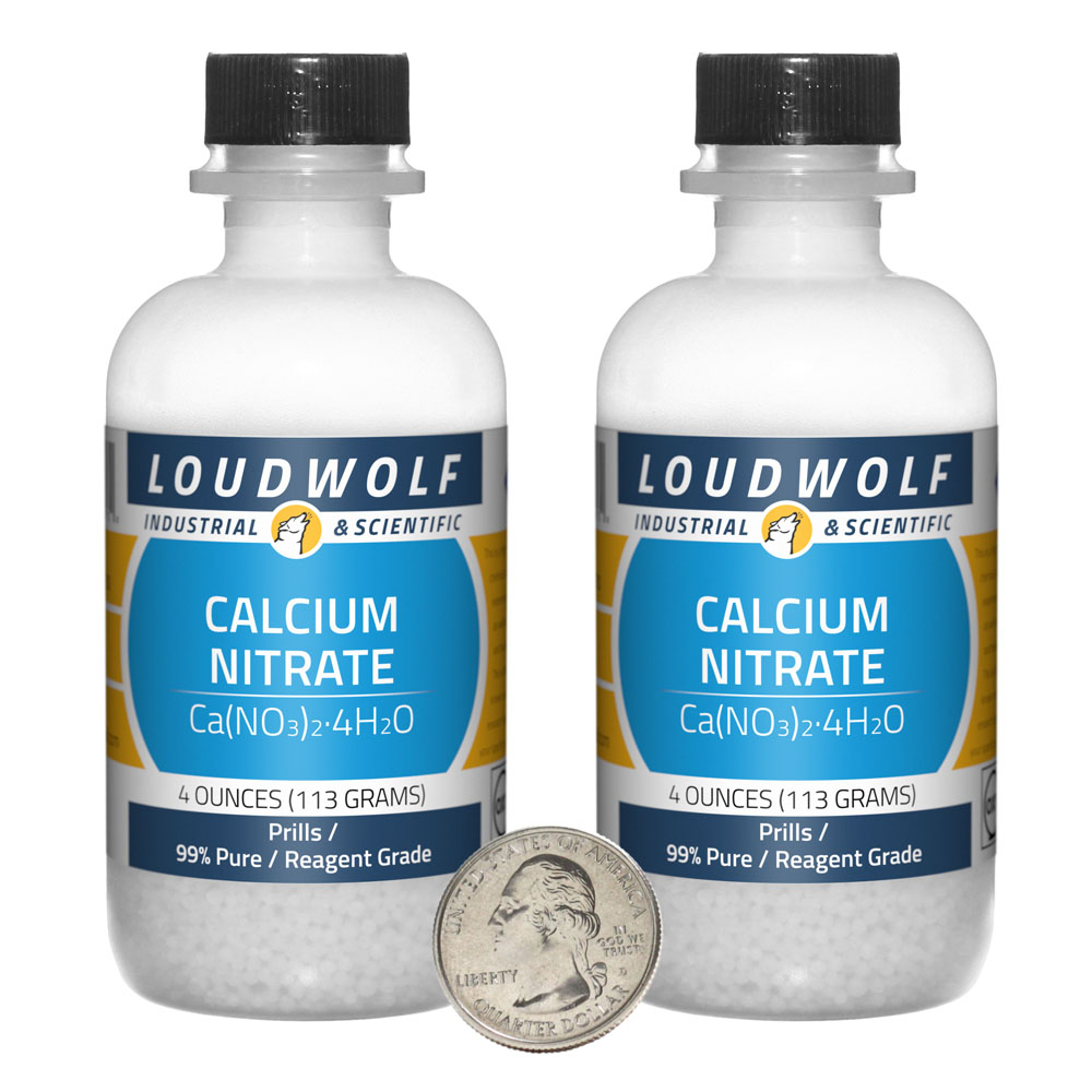 The item for sale is 8 Ounces (227 Grams) of Calcium Nitrate (Ca(NO3)2·4H2O). You get 2 bottles each containing 4 ounces of product. Calcium Nitrate has many uses. The total Nitrogen content is 15.50% (1% Ammonical and 14.50% Nitrate). The total Calcium content is 19%.