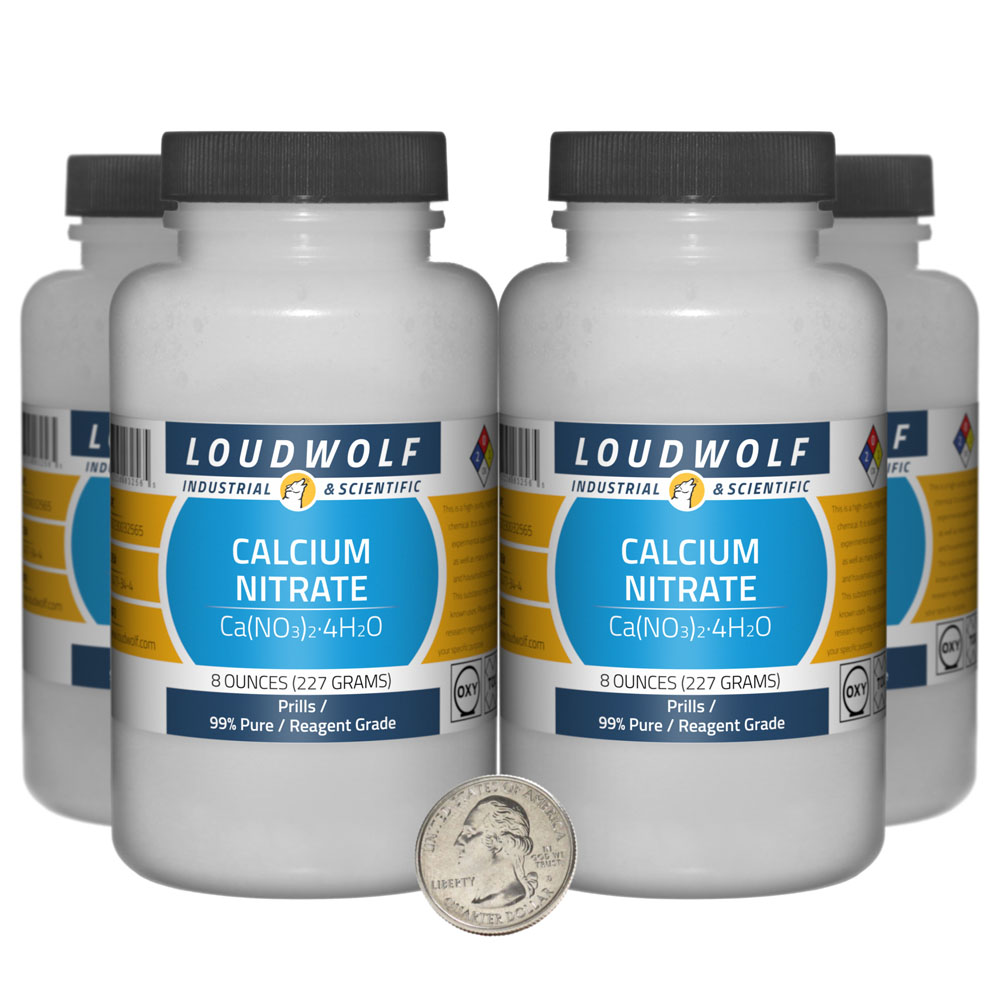 The item for sale is 2 Lb (32 Ounces) of Calcium Nitrate (Ca(NO3)2·4H2O). You get 4 bottles each containing 8 ounces of product. Calcium Nitrate has many uses. The total Nitrogen content is 15.50% (1% Ammonical and 14.50% Nitrate). The total Calcium content is 19%.