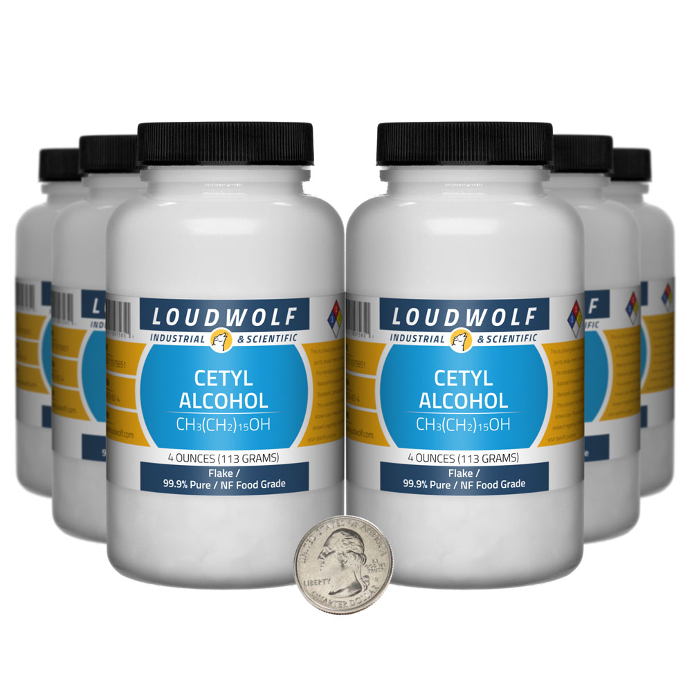 The item for sale is 1.5 Lb (24 Ounces) of Cetyl Alcohol (CH3(CH2)15OH). You get 6 bottles each containing 4 ounces of product. Cetyl Alcohol, also known as Palmityl Alcohol, is a fatty alcohol that forms a solid waxy flake at room temperature. Cetyl Alcohol is commonly used in cosmetics. |