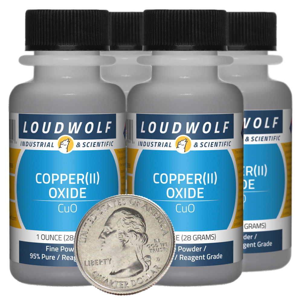 The item for sale is 4 Ounces (113 Grams) of Copper(II) Oxide (CuO). You get 4 bottles each containing 1 ounces of product. Copper(II) Oxide is an organic oxide of copper. It is used in the production of copper salts, welding copper alloys, and as a pigment in ceramic glazes.