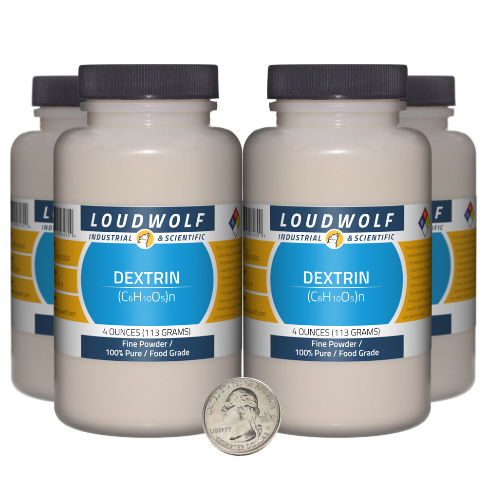 The item for sale is 1 Lb (16 Ounces) of Dextrin ((C6H10O5)n). You get 4 bottles each containing 4 ounces of product. Dextrin, also known as English gum, was processed from 100% pure corn starch. No acid treatment or chemicals added. For Maltodextrin, check out our other listing. |