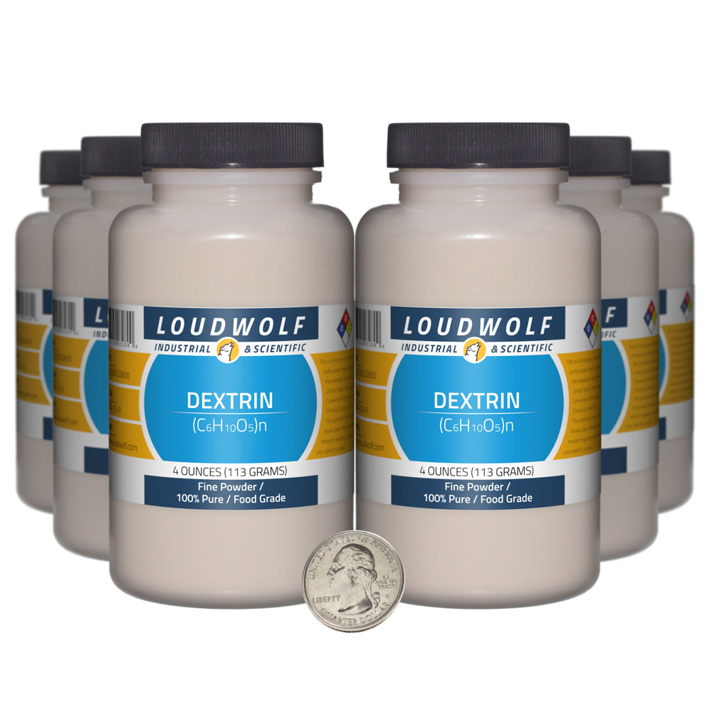 The item for sale is 1.5 Lb (24 Ounces) of Dextrin ((C6H10O5)n). You get 6 bottles each containing 4 ounces of product. Dextrin, also known as English gum, was processed from 100% pure corn starch. No acid treatment or chemicals added. For Maltodextrin, check out our other listing. |