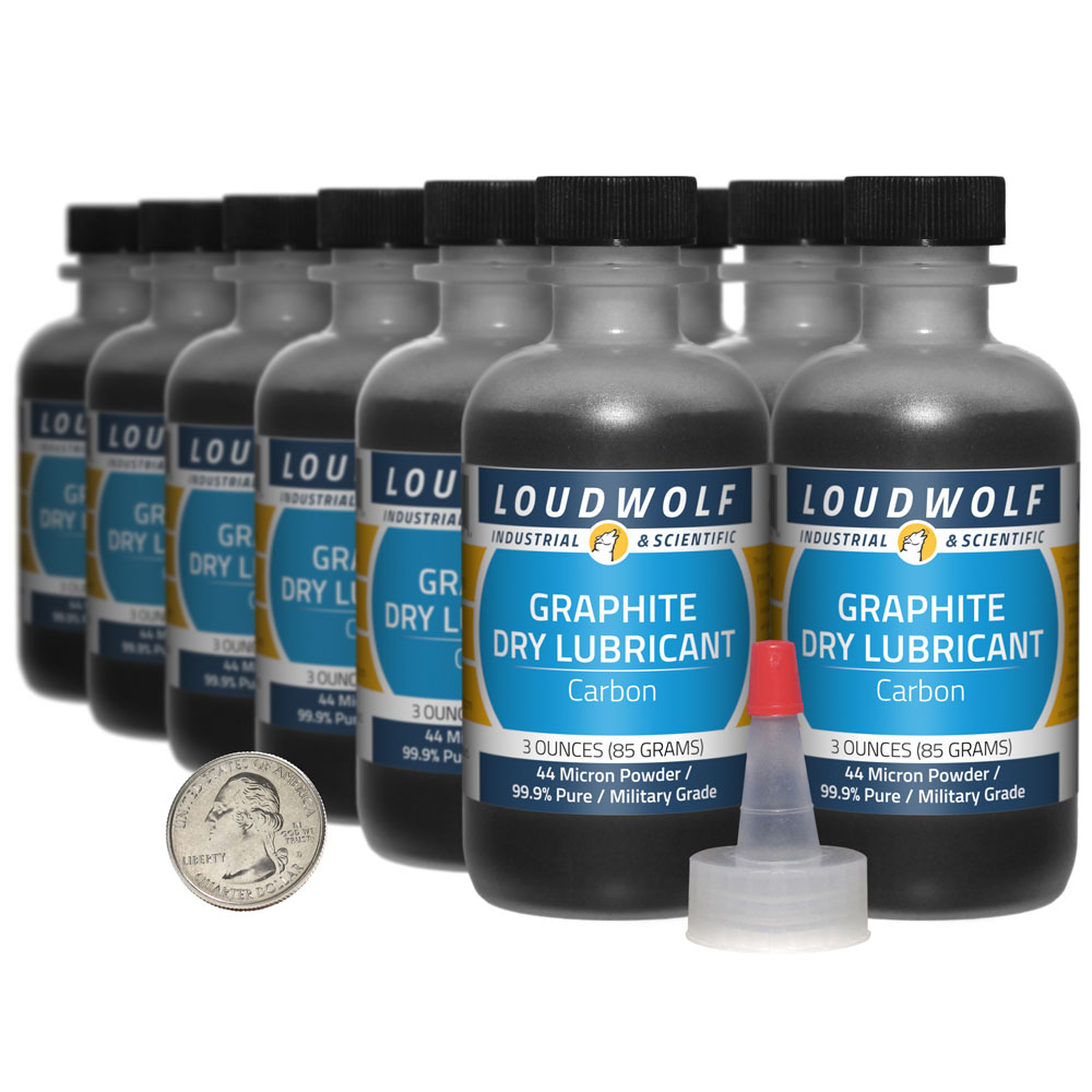 The item for sale is 2.3 Lb (36 Ounces) of Graphite (Carbon). You get 12 bottles each containing 3 ounces of product. Graphite is commonly used a dry lubricant where oils and greases are not ideal. This powder is incredibly fine with particles no larger than 44 Microns. For other dry lubricants, including Molybdenum Disulfide, check out our other listings. |