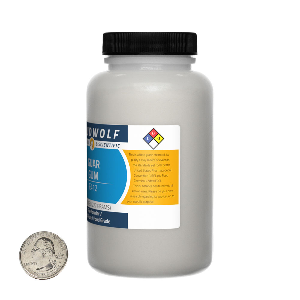 The item for sale is 8 Ounces (227 Grams) of Guar Gum (E412). Guar Gum, also known as Guaran, is produced from dehusked, milled, and screened non-GMO guar seeds. Guar Gum has eight times the thickening power of corn starch and is commonly used as a thickener.
