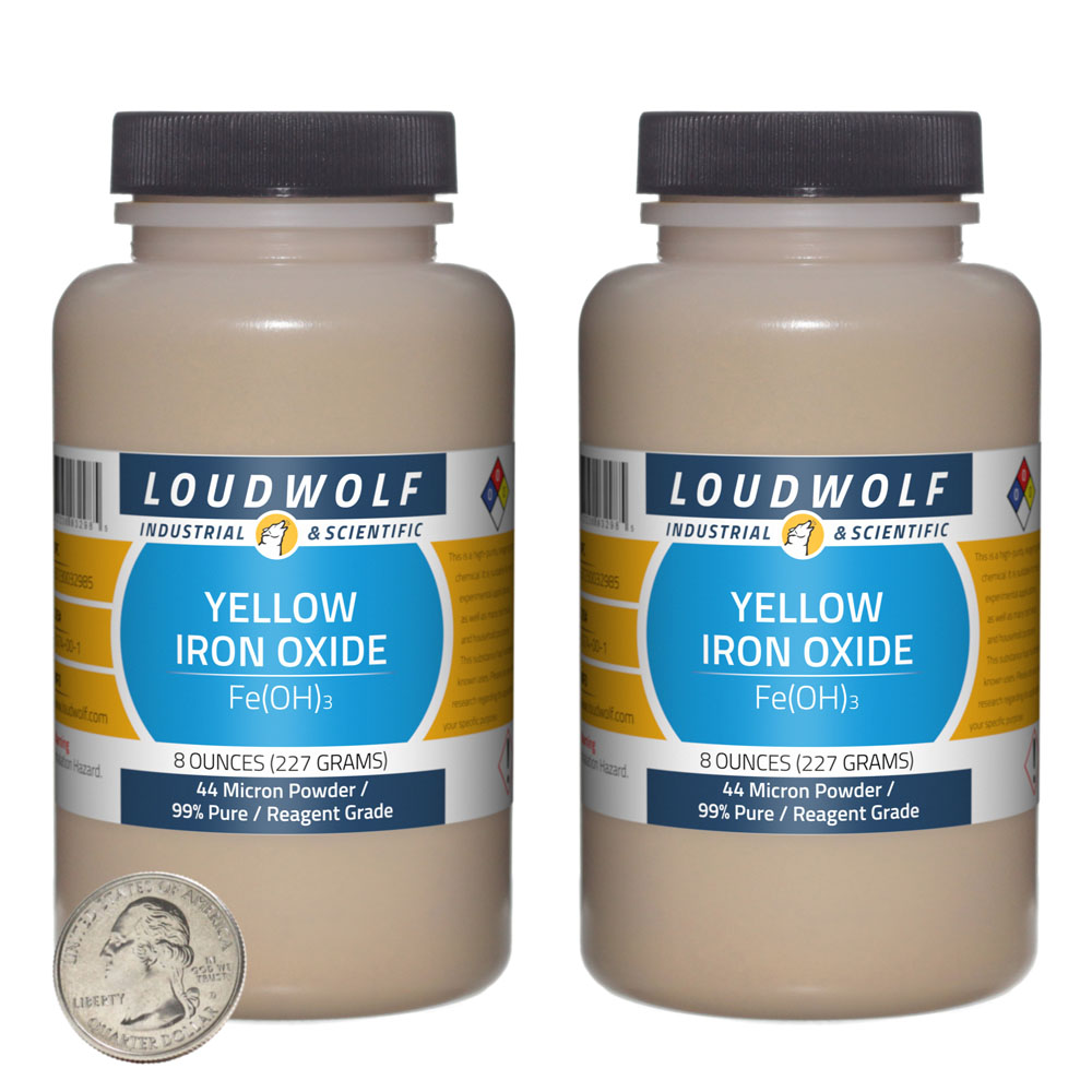 The item for sale is 1 Lb (16 Ounces) of Iron Oxide Yellow (Fe(OH)3). You get 2 bottles each containing 8 ounces of product. Iron Oxide Yellow is derived from ferrous sulfate by heat soaking, dehydration, decomposition, washing, filtration, drying, and grinding. Yellow Iron Oxide is commonly used as a pigment to achieve a vibrant yellow color. For other popular pigments, including Red Iron Oxide, Black Iron Oxide, Zinc Oxide, and Titanium Dioxide, check out our other listings. |