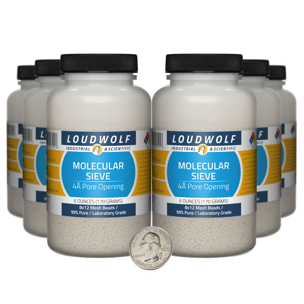 The item for sale is 2.3 Lb (36 Ounces) of Molecular Sieve (4Å Pore Opening). You get 6 bottles each containing 6 ounces of product. Molecular Sieve, also known as Synthetic Zeolite, is a spherical alumino-silicate. Because if its Type A crystal structure and 4Å pore opening, it will adsorb oxygen, nitrogen, carbon dioxide, and straight-chain hydrocarbons without adsorbing aromatics and branched-chain hydrocarbons.
