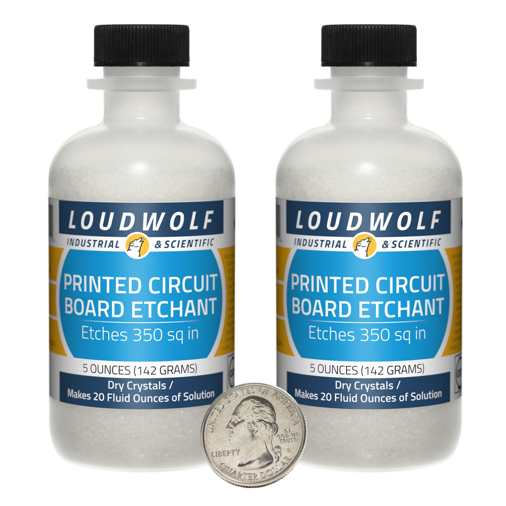 The item for sale is 10 Ounces (283 Grams) of PCB Etchant (Etches 350 sq in). You get 2 bottles each containing 5 ounces of product. PCB Etchant, also known as Metal Etchant, contains the active ingredient is Ammonium Persulfate. Mix crystals with water in a 1-4 ratio. Ammonium-Persulfate-based etchants are colorless, odorless, and non-staining. The only by-product of the etching process is a small amount of pure oxygen. For other popular etchants, including Ferric Chloride and Copper Sulfate, check out our other listings. |