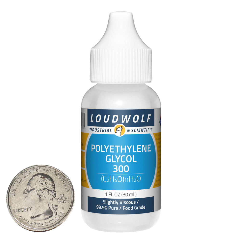 The item for sale is 1 Fluid Oz (30 mL) of Polyethylene Glycol 300 ((C2H4O)nH2O). Polyethylene Glycol 300, also known as PEG, is a flexible, water-soluble polyether compound with applications ranging from medicine to industrial manufacturing. For propylene glycol or glycerin, check out our other listings. |