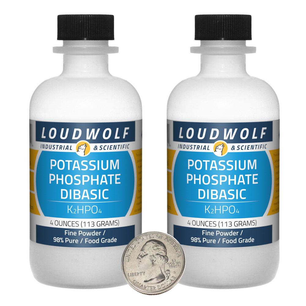 The item for sale is 8 Ounces (227 Grams) of Potassium Phosphate Dibasic (K2HPO4). You get 2 bottles each containing 4 ounces of product. Potassium Phosphate Dibasic is a water soluble salt commonly used as a source of phosphorus and potassium. For Potassium Phosphate Monobasic, check out our other listing. |