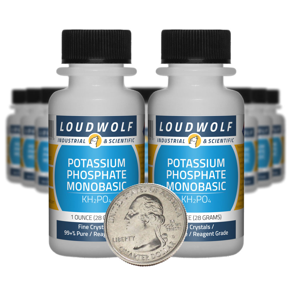 The item for sale is 1.3 Lb (20 Ounces) of Potassium Phosphate Monobasic (KH2PO4). You get 20 bottles each containing 1 ounces of product. Potassium Phosphate Monobasic is a soluble salt of potassium and the dihydrogen phosphate ion. It is commonly used as a food additive.