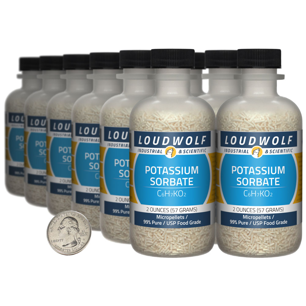 The item for sale is 1.5 Lb (24 Ounces) of Potassium Sorbate (C6H7KO2). You get 12 bottles each containing 2 ounces of product. Potassium Sorbate, also known as E202, is the potassium salt of sorbic acid. It is very soluble in water and is commonly used as a preservative.