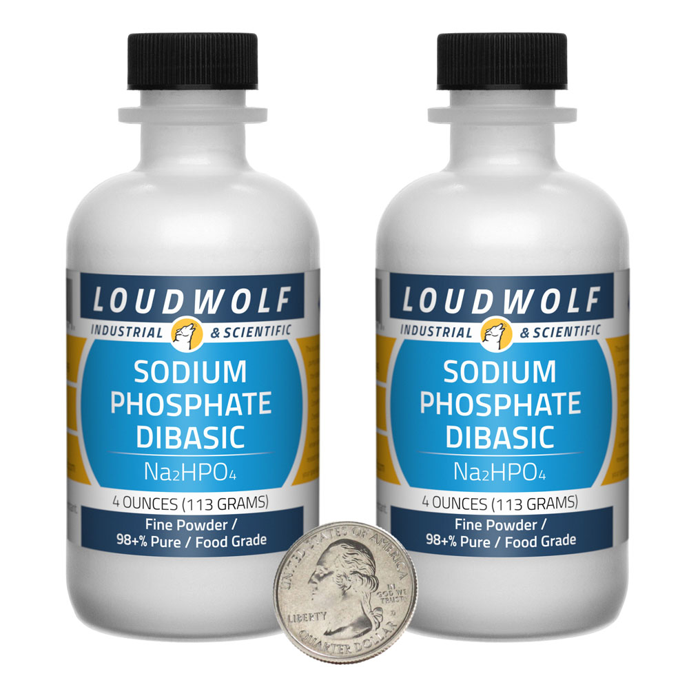 The item for sale is 8 Ounces (227 Grams) of Sodium Phosphate Dibasic (Na2HPO4). You get 2 bottles each containing 4 ounces of product. Sodium Phosphate Dibasic, also known as Disodium Phosphate, is a water-soluble inorganic compound. For Trisodium Phoshpate, check out our other listings. |