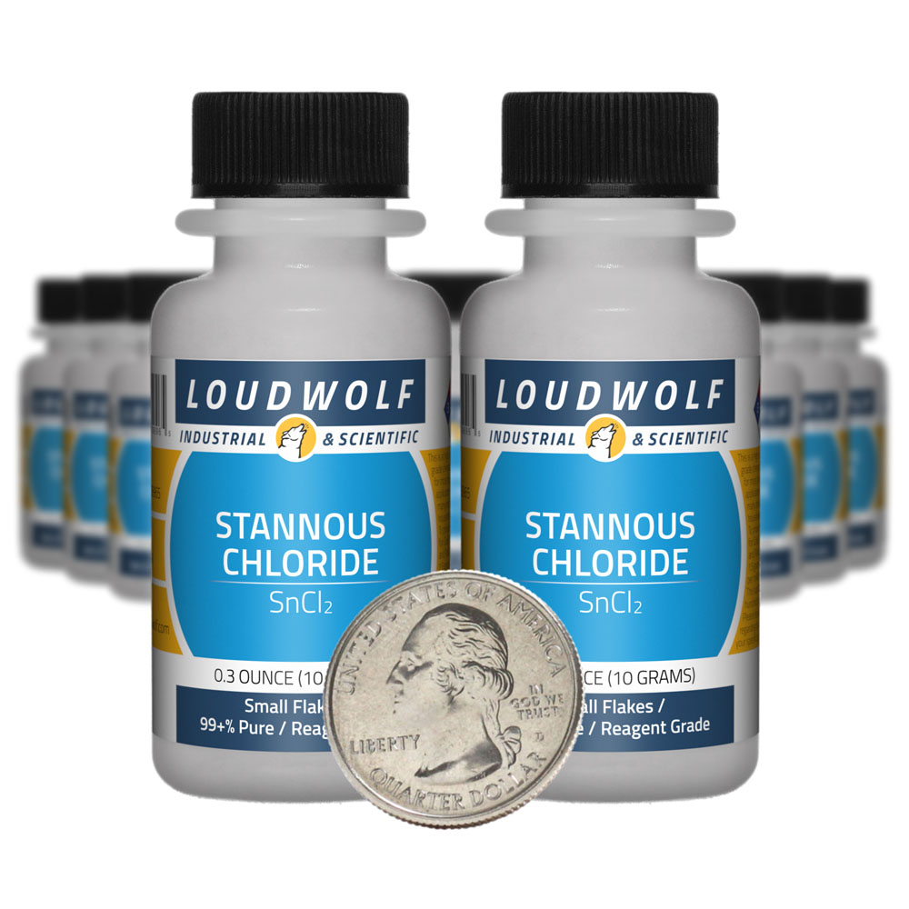 The item for sale is 7 Ounces (198 Grams) of Stannous Chloride (SnCl2). You get 20 bottles each containing 0.35 ounces of product. Stannous Chloride is a key ingredient in Stannous Chloride Test Solution, which is used to test for precious metals including Gold, Platinum, and Palladium. To mix your own test solution, add SnCl2 to water in a 1.5g / mL ratio. If you’d like to buy a pre-made, long-lasting test solution in a dropper bottle, check out our other listings. |