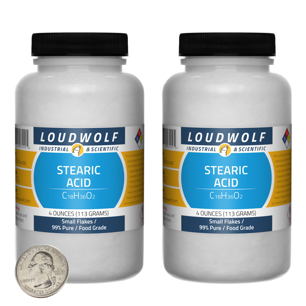 The item for sale is 8 Ounces (227 Grams) of Stearic Acid (C18H36O2). You get 2 bottles each containing 4 ounces of product. Stearic Acid is a naturally abundant saturated fatty acid. In soapmaking, Stearic Acid adds a pearly effect to shampoos, soaps, and lotions. For other soapmaking products, including Sodium Hydroxide, Potassium Hydroxide, and Polyethylene Glycol, check out our other listings. |